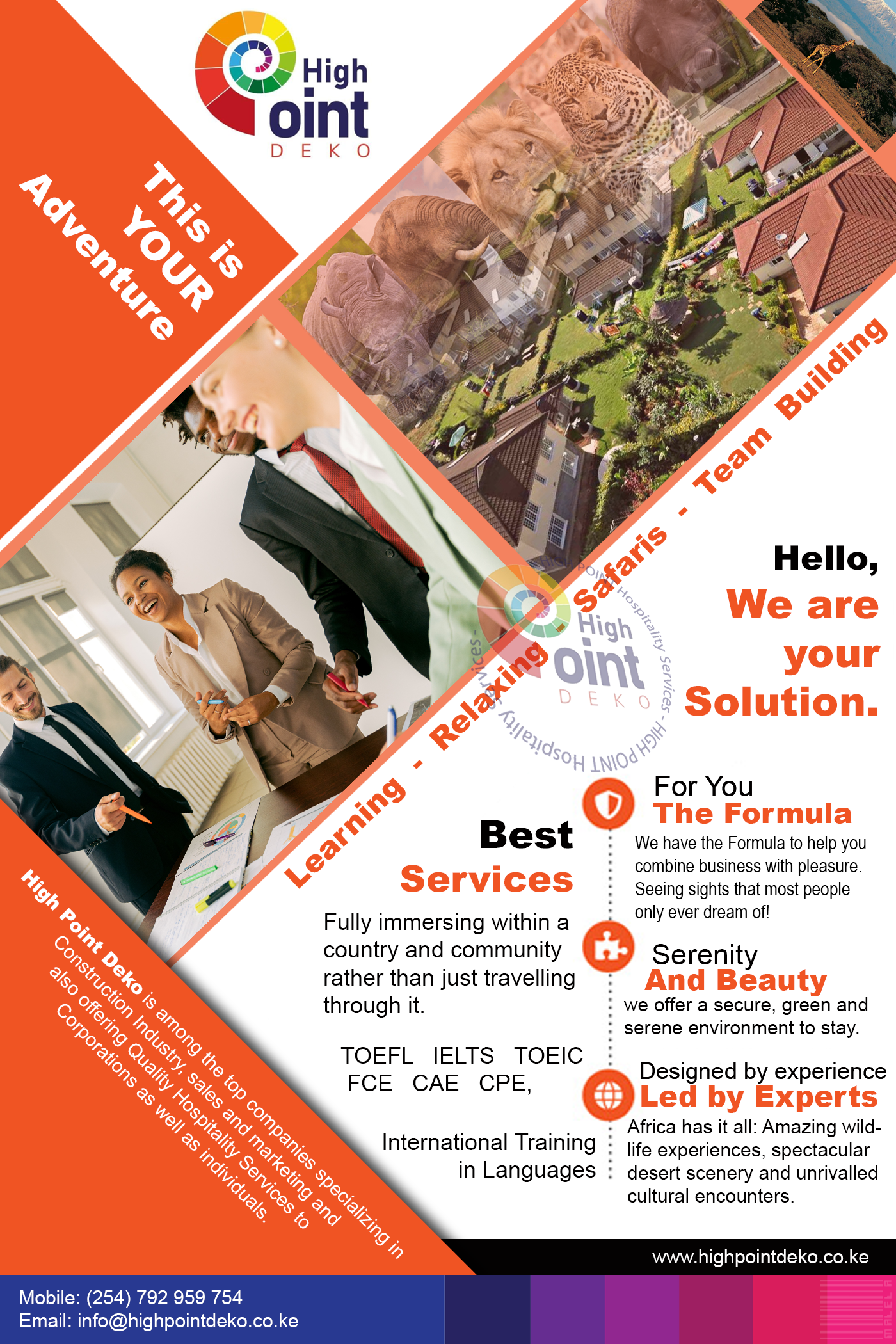 We offer an Amazing Support system for your Training, Safaris, Team Building activities. A Formula that will help you combine business with pleasure.